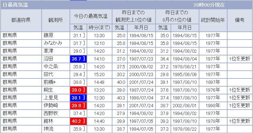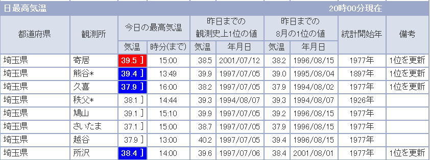 熊谷と言えばこの時期天気予報で良く聞く地名だ。今日も例外なく朝から超暑い・・・。そんな夏の暑いこの時期、なんと群馬で気温40度オーバーを記録。群馬県館林で40.2度を観測したのである。で、さぞかし南の方はもっと暑いだろと思ったが、この時期、南の沖縄は30度そこそこの気温なんですね。いつまでこの暑さは続くのだろうか・・・。